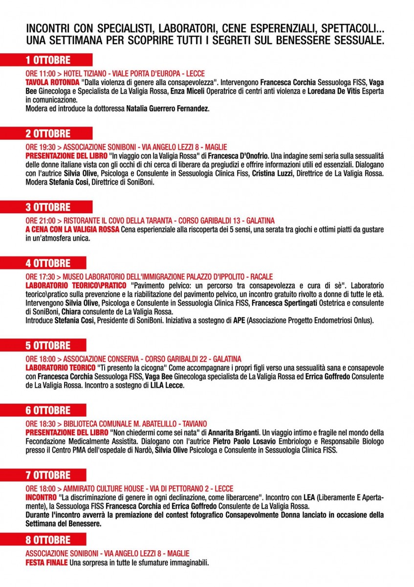 La settimana sarà inaugurata da una tavola rotonda dal titolo Dalla violenza di genere alla consapevolezza, al Grand Hotel Tiziano e dei Congressi, in viale Porta d’Europa, Lecce, sabato 1 ottobre alle ore 11. Interverranno la sessuologa Francesca Corchia, la ginecologa Vaga Bee, la responsabile del centro anti violenza Enza Miceli e l’esperta di comunicazione e pari opportunità Loredana De Vitis; introduce e modera la dottoressa Natalia Guerrero Fernandez de La Valigia Rossa. A questo incontro ne seguiranno altri tra Galatina, Maglie e Lecce, tra cui il contest fotografico su Consapevolmente Donne, lanciato lo scorso agosto dall’associazione SoniBoni in collaborazione con La Valigia Rossa. Sessualità, discriminazione, violenza ospedaliera e diritto all’informazione, alcuni dei temi che saranno affrontati con gli specialisti FISS, in collaborazione con APE, LILA e LEA.