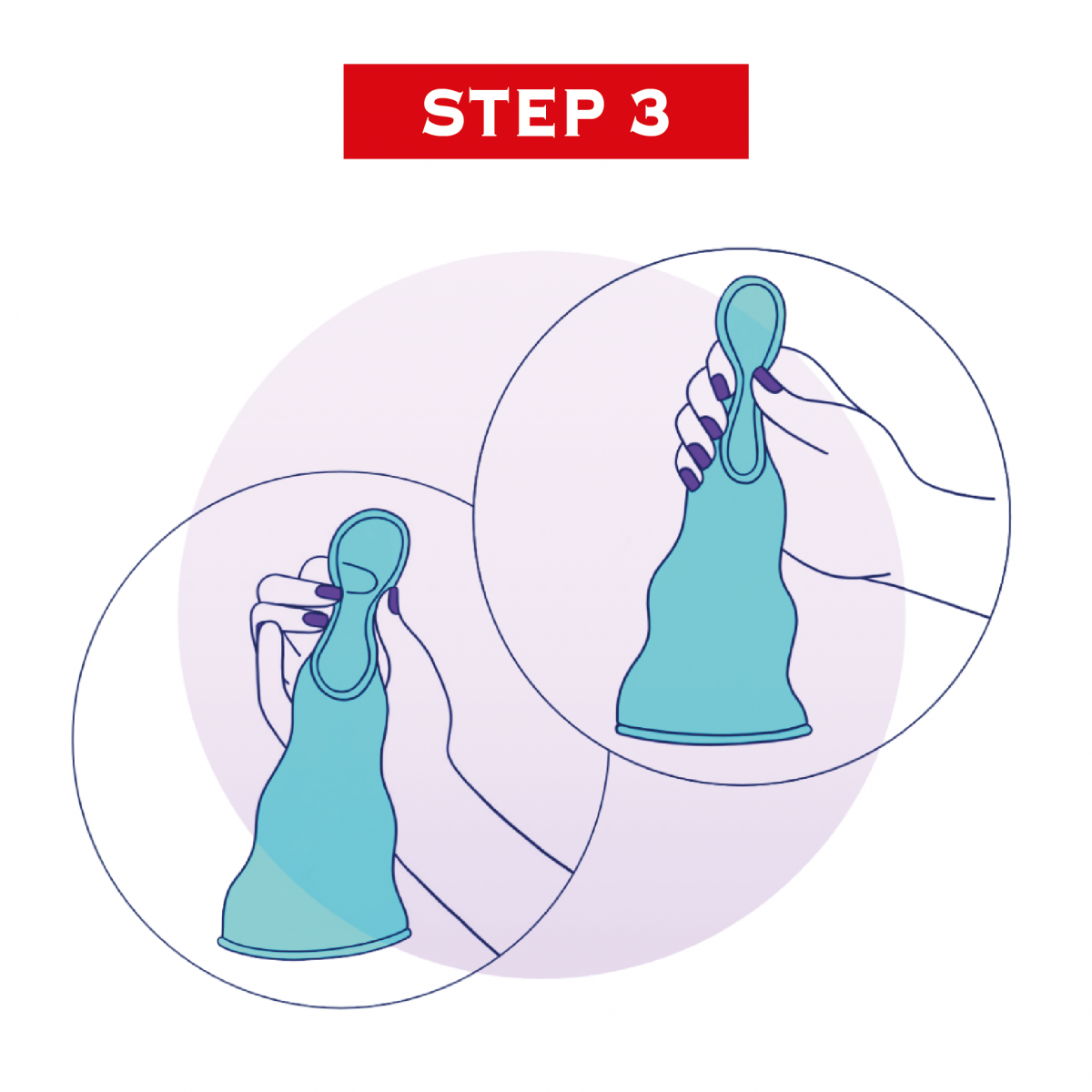 Tieni in mano il preservativo prendendolo per l'anello interno superiore e facendo pendere la parte aperta del preservativo in basso. Una volta che il preservativo è completamente esteso, stringi (senza torcere) l'anello interno in modo che diventi lungo e stretto.