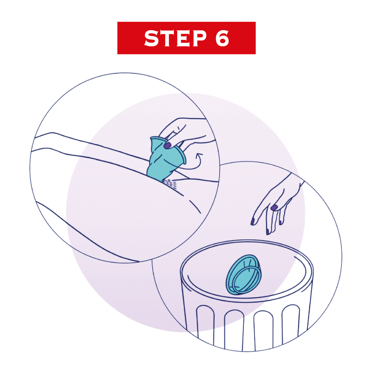 Ruota l'anello esterno ed estrai delicatamente il preservativo, gettandolo nella spazzatura. Non sciacquare il preservativo! Inoltre, non riutilizzarlo. Ciascun preservativo è solo per uso singolo.
